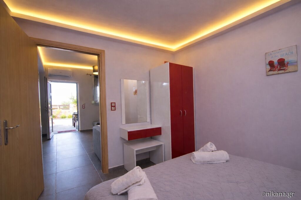 Manji (35m2) crveni apartman u prizemlju je predviđen za četiri odrasle osobe. U spavaćoj sobi se nalazi jedan francuski krevet, dok je dnevnoj jedna ugaona sofa na razvlačenje i druga manja sofa (dužine 1,15m) koja se ne razvlači, a predviđena je za jedno mlađe dete. Kuhinja je opremljena i ima rešo i mali frižider, a u kupatilu je tuš kabina.