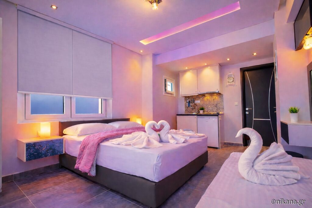 Četvorokrevetni apartman na spratu takođe ima pogled na more i površinu od 35m2. U spavaćoj sobi se nalazi francuski ležaj, dok je u dnevnoj ugaona garnitura na razvlačenje. Kuhinja je opremljena i ima manji frižider i rešo. U kupatilu postoji tuš kabina.
